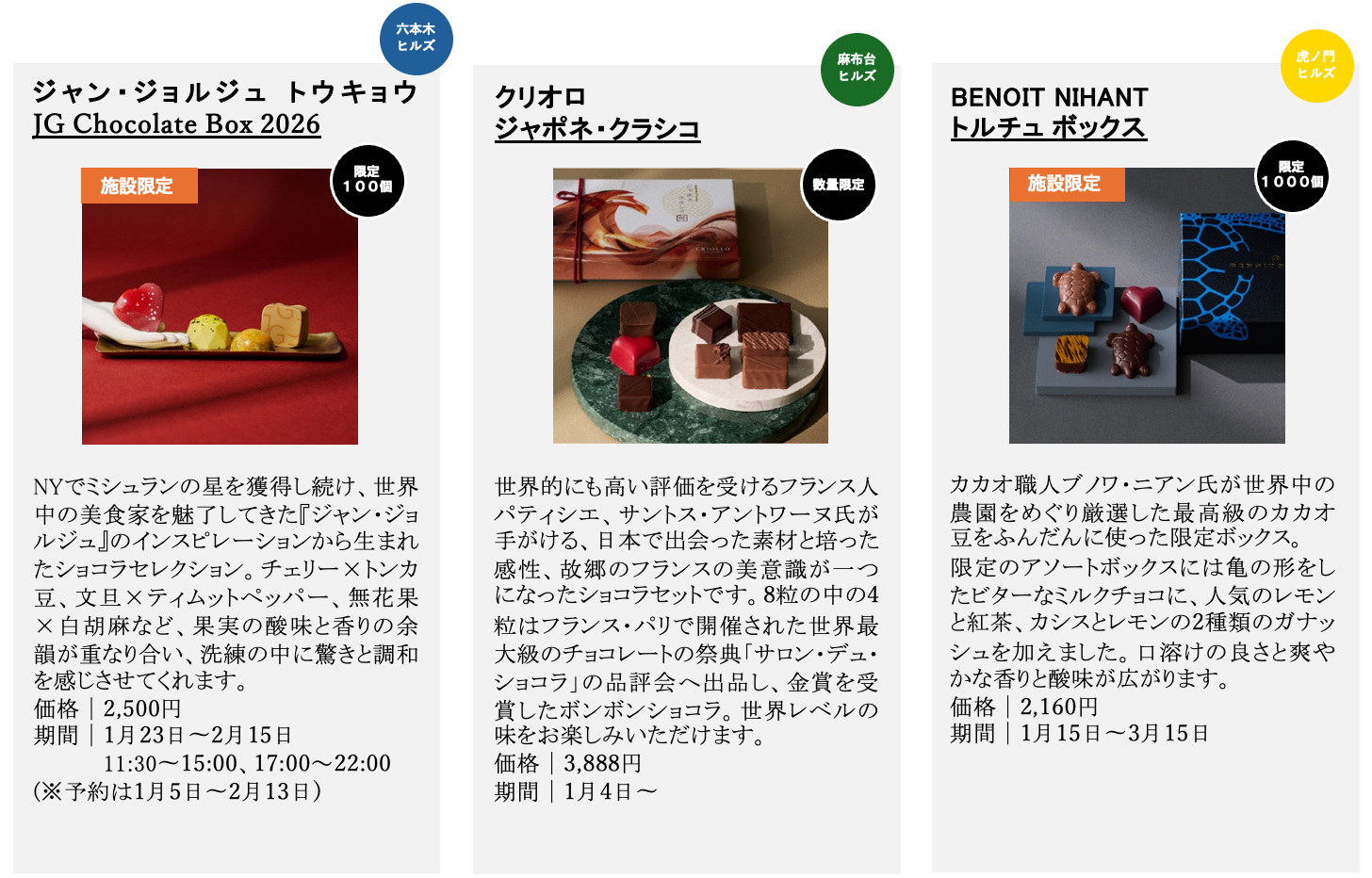 六本木ヒルズでは、「ジャン・ジョルジュ トウキョウ」から、シェフが考案したユニークな素材の組み合わせが楽しめるJG Chocolate Box 2026や、82%のハイカカオを使用した「ブリコラージュ ブレッド アンド カンパニー」のショコラクラシックなど、個性豊かなスイーツの数々を展開します。麻布台ヒルズでは、日本とフランスの融合を繊細に表現した「クリオロ」のショコラセットや、旬の苺と2種類のチョコレートを使った「Minimal The Specialty」のガトーショコラ ソフト 苺など、スイーツの奥深い味わいを感じていただけます。虎ノ門ヒルズでは、「AM STRAM GRAM」からたっぷりのベリーを使ったフレッシュベリーとチョコカスタードクリームのタルトや、「cask」よりピスタチオ・紅茶味を含む5種のマカロンなど、バレンタイン・ホワイトデー限定の商品を多数取り揃えています。