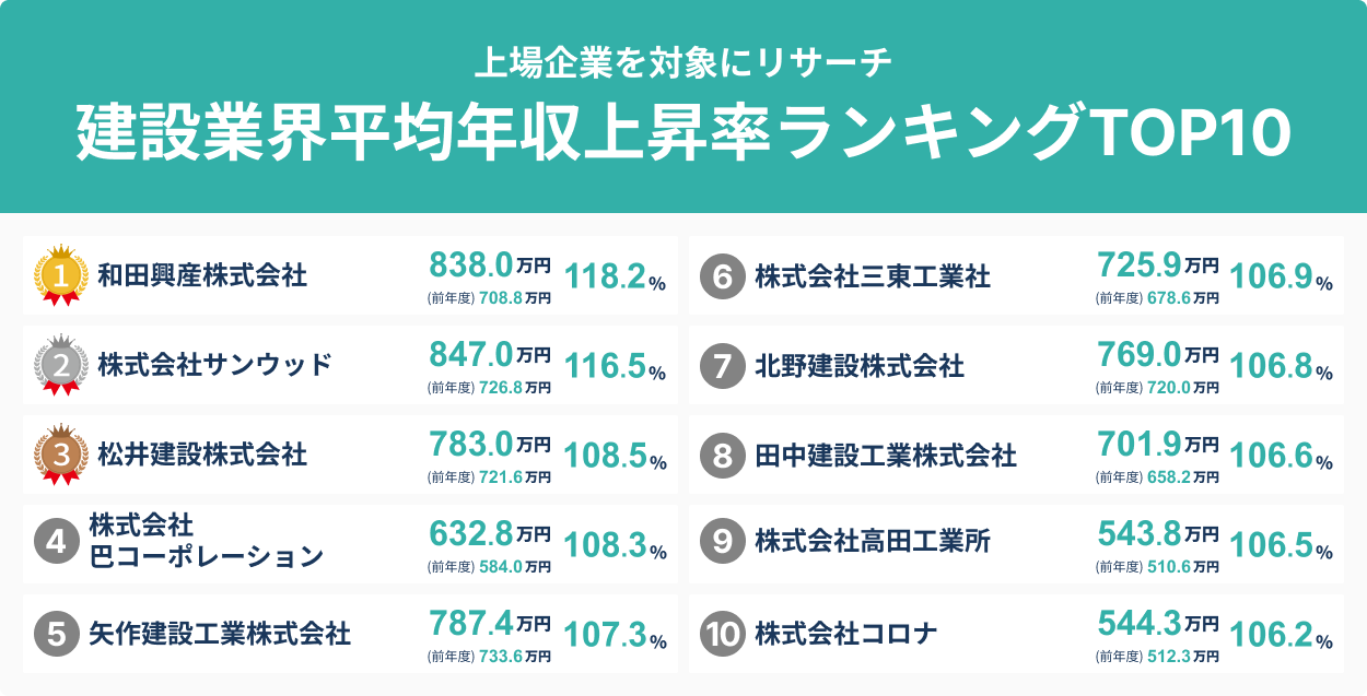 建設業界、平均年収上昇率ランキングTOP10を発表!/SalesNow DBレポート