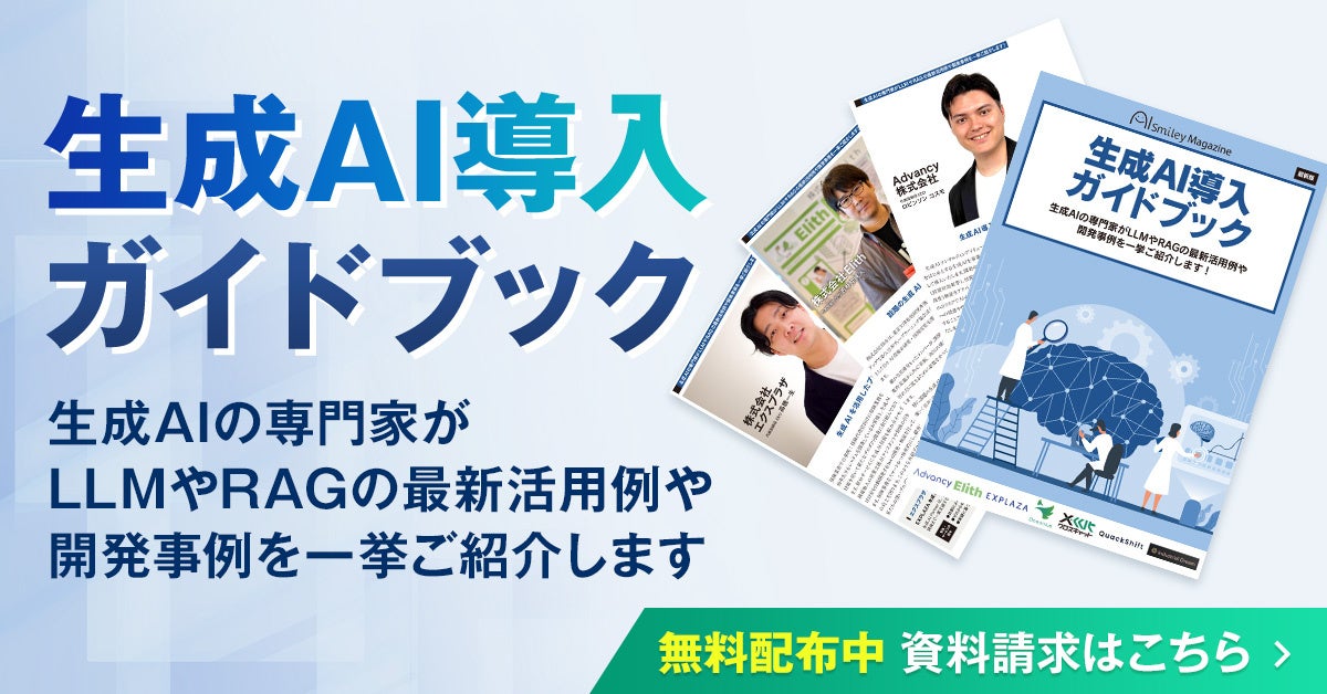 AIポータルメディア『AIsmiley』は、AI導入推進の一環として、”生成AI”のユースケースや製品の特長をまとめた「生成AI導入ガイドブック」を配信開始しました。