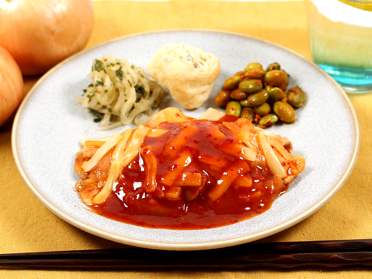 豚バラ肉をローストし玉ねぎを添えて、たっぷりのチーズとコチュジャンソースを使用した、豚バラ肉のチーズコチュジャンです。甘辛いソースとチーズの相性は抜群です。ソースとチーズ、具材をよく絡めてお召し上がりください。