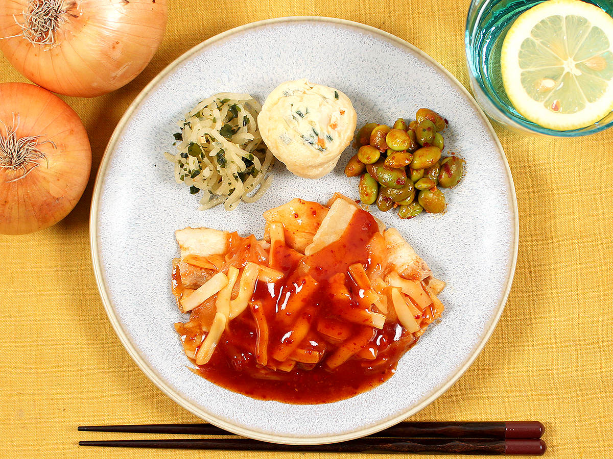 副菜は、大根のわかめあえ、チヂミボール、枝豆のザクザクラー油です。