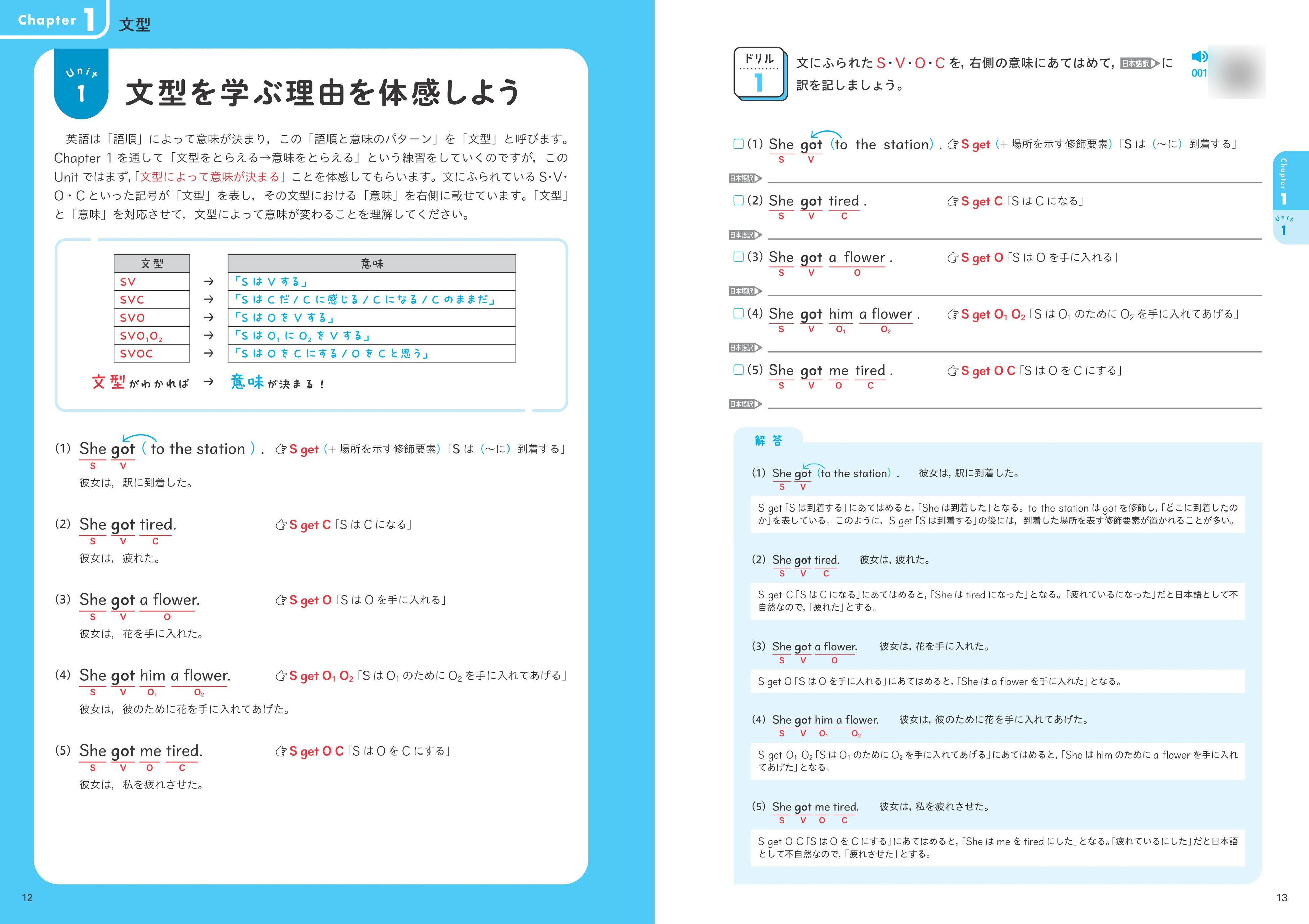 6つのChapter、35のUnitで、確実に力がつきます。各Unitは、イラストや図表を使った解説とドリル1-3の4ページ構成で、ドリル1が「基礎」、ドリル2・3が「応用」となっています。類似した英文に何度も触れられる構成で、順番にドリルに取り組むと自然と反復学習ができるつくりです。