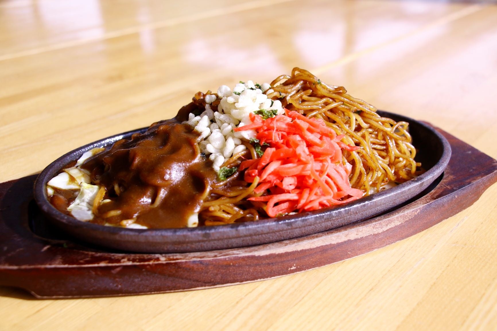 焼きそばにカレーをかけて食べる「カレー焼きそば」。「カレー焼きそば」は、お店によってトッピング・提供方法が様々で、「gran 喜一」では、熱々に熱した鉄板の上に焼きそばと特製カレーを盛りつけ、揚げ玉と紅ショウガをトッピング。最後の一口まで熱々の食事をお楽しみいただけます。休日限定10食のみ、こだわり地元グルメを是非お楽しみください。