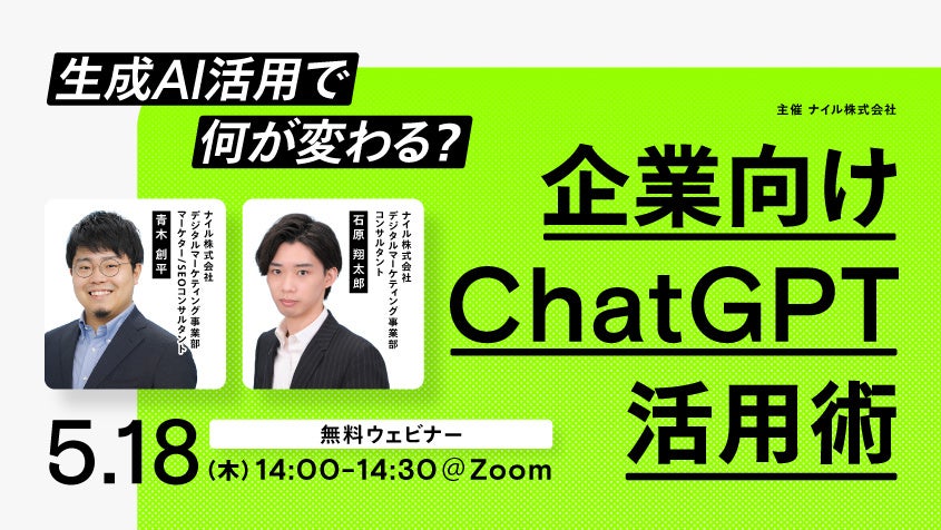 マーケティングDX事業を営むナイル株式会社(本社:東京都品川区、代表取締役:高橋 飛翔、以下、ナイル)は、企業向けにChatGPTをはじめとした生成AIの活用を社内で推進する方法から、導入プロセスまで徹底解説するウェビナーを、5月18日(木)14:00より無料にて開催します。