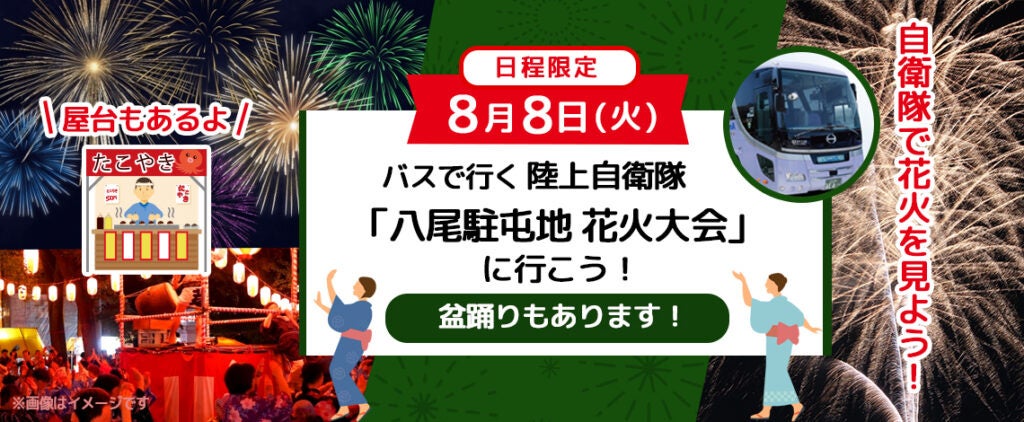 8月8日(火) 限定〈往復バスプラン〉お一人様¥2,980- 4年ぶりの開催!陸上自衛隊 八尾駐屯地 盆踊り&花火大会 皆様自衛隊駐屯地で花火を見よう!!