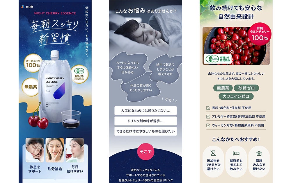 データとクリエイティブの力でマーケティングコミュニケーションを設計し、企業のマーケティング AX を支援するアライドアーキテクツ株式会社(本社:東京都渋谷区、取締役社長:村岡弥真人、証券コード:6081、以下「当社」)は、AuB株式会社(本社:東京都中央区、代表取締役:鈴木啓太、以下「AuB」)が 2025年10月より展開する新商品、タルトチェリー濃縮果汁「NIGHT CHERRY ESSENCE(ナイトチェリーエッセンス)」の訴求開発を支援いたしました。