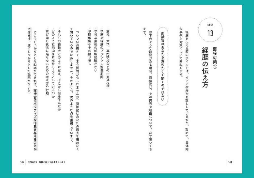 本書は、はたらくことに不安を抱え、自信が持てない人に向けて、自分の強みを見いだし、はたらく自信を育てるプロセスをSTAGE1~3の3部構成で解説します。STAGE1 では「不安をなくして自信をつけよう」をテーマに、ネガティブな感情や不安を取り除く方法を紹介。自信をつけて就職に成功した3人の事例も掲載し、似た境遇を知ることで自分の可能性をイメージできます。STAGE2では「自分を知って自信をつけよう」と題し、強みやキャリアビジョンを見つける自己分析の方法を紹介。STAGE3では「面接に向けて自信をつけよう」をテーマに、就職活動の本番での自己表現について解説します。特に難しさを感じやすい「経歴の伝え方」は、11人の事例を通じ、経歴のブランクや挫折経験の具体的な伝え方を盛り込んでいます。