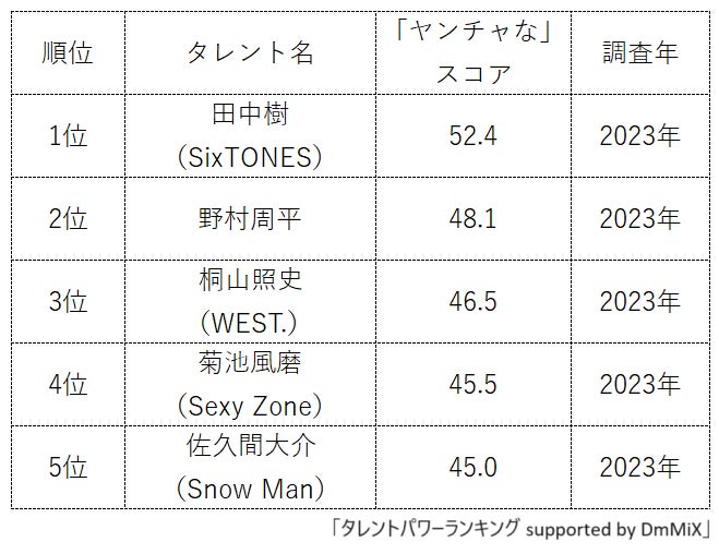 『タレントパワーランキング』では、タレントパワーランキングに登録されている「ヤンチャな」のイメージを持たれているタレントを陽キャタレントとし、各イメージスコアを調査。