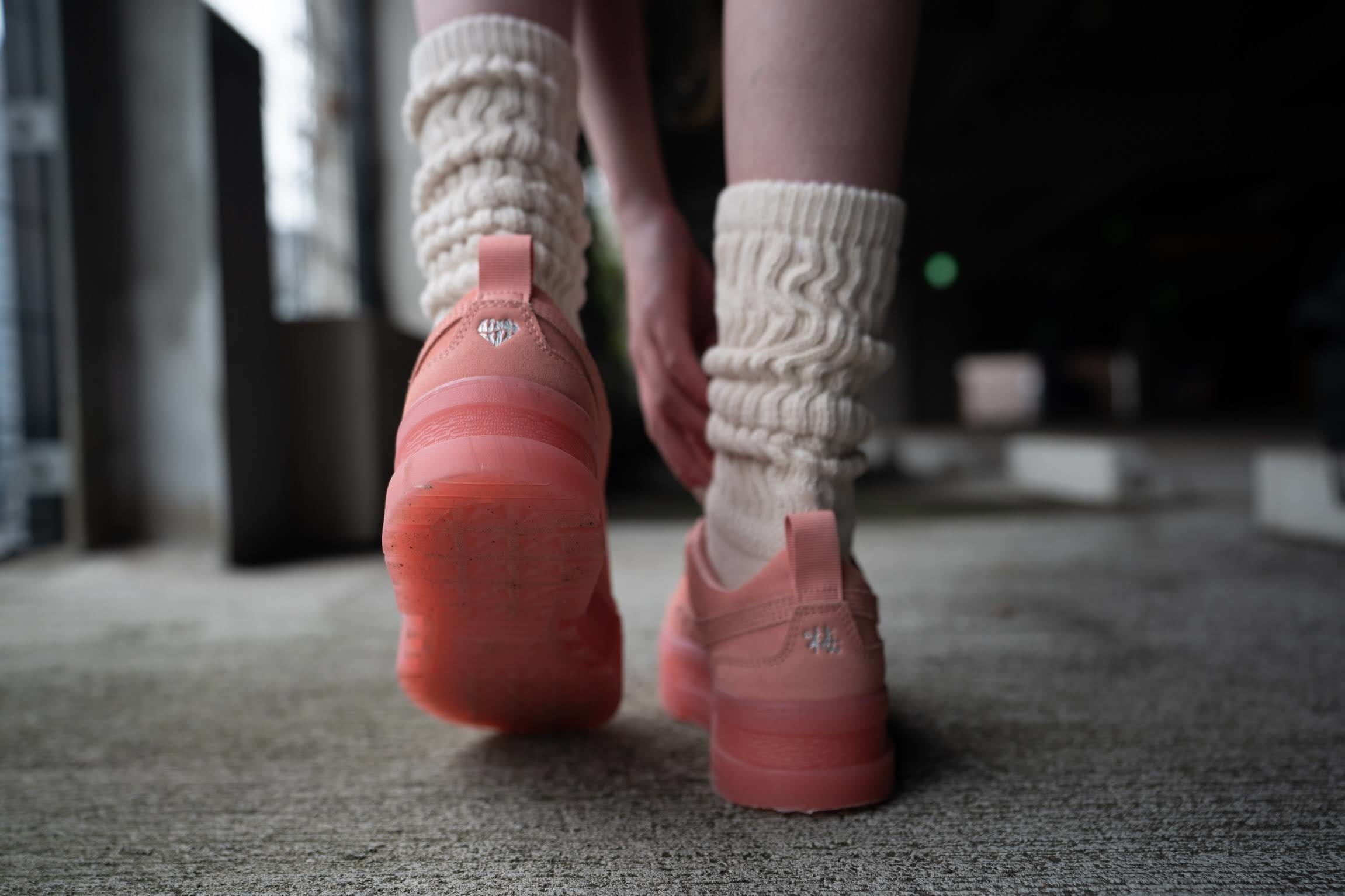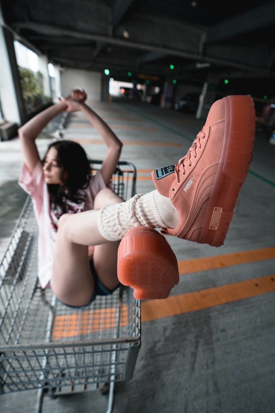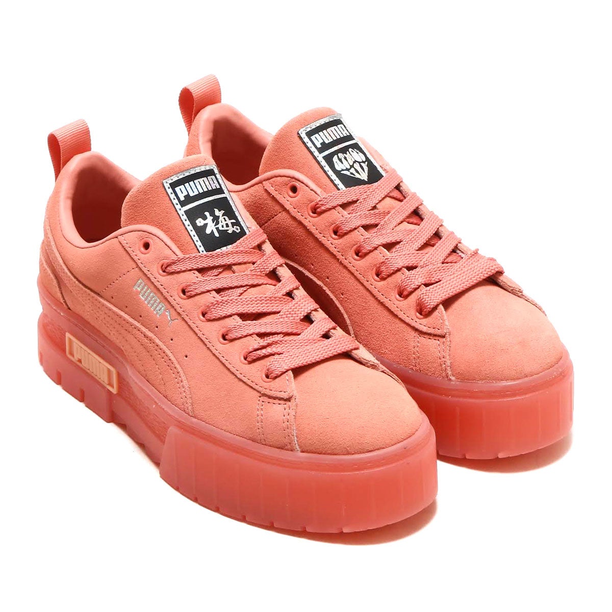 昨年発売し、瞬く間に完売した厚底スニーカー『 CALI WEDGE 』 に 引き続き 、今回のコラボレーションはPUMA 新作の『 MAYZE 』2色で登場 。シュータンの右側にはFR2梅のロゴ、左側にはatmos pinkのハートロゴが使われていてキュートな1足になっています。同系色のクリアソールで足長効果抜群。