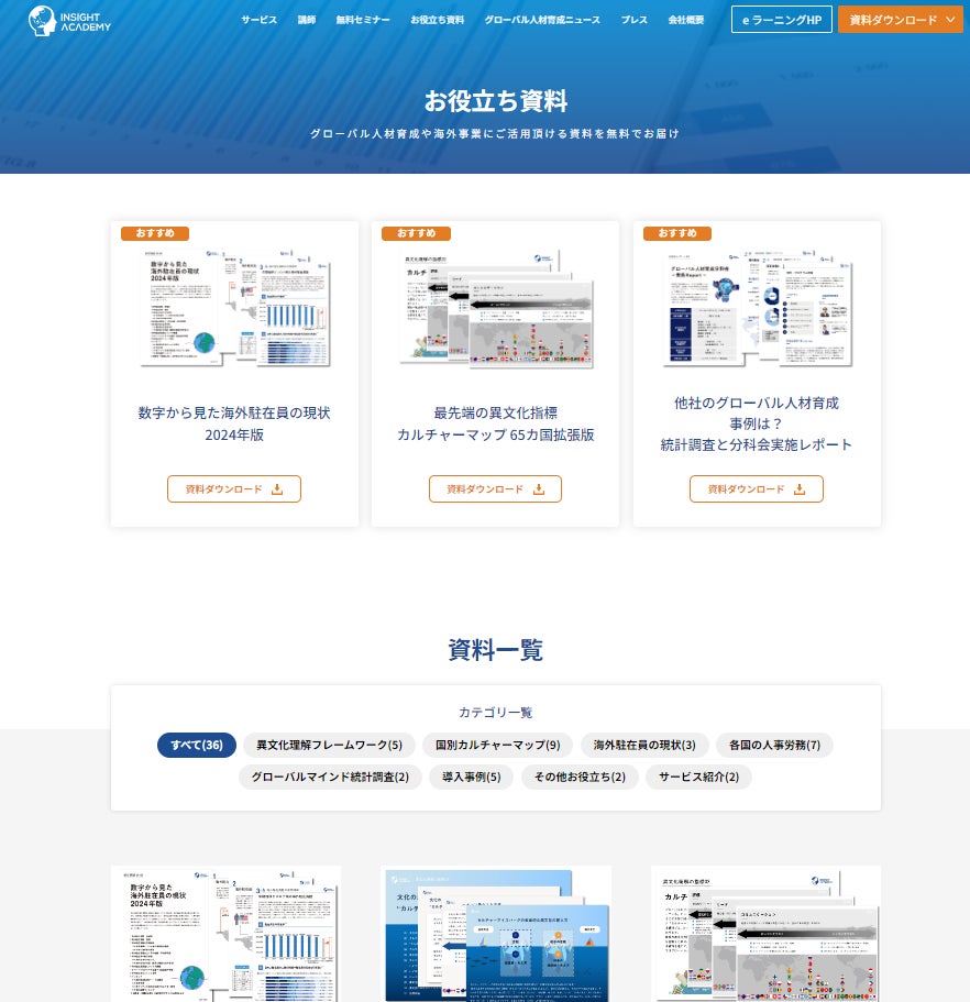 インサイトアカデミーでは、人事部や海外事業部ご担当者様を対象とした「無料レポート/資料」を多数ご用意しております。