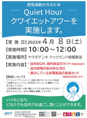 株式会社ヤマダホールディングス(本社:群馬県高崎市、代表取締役会長 兼 社長 CEO:山田 昇、以下、ヤマダホールディングス)では、公益社団法人 相模原青年会議所と連携し、感覚過敏の方が安心してお買い物をしていただけるよう、2023年4月8日(土)、ヤマダデンキ テックランド 相模原店にて「クワイエットアワー」を実施いたします。