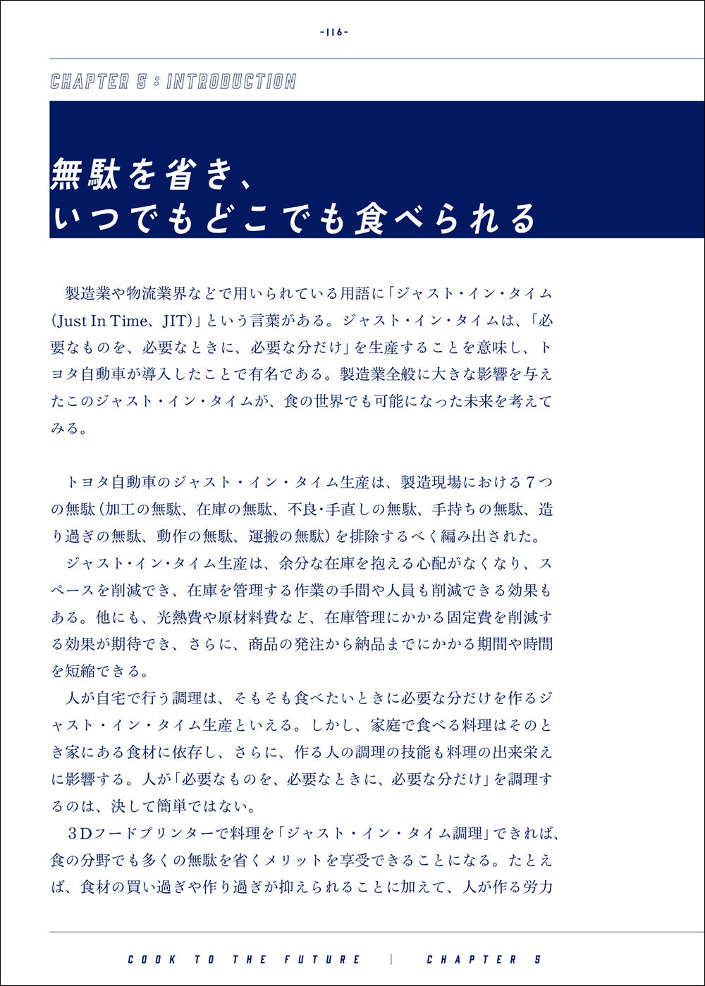 ジャスト・イン・タイム料理で、時間や場所の制限がなく、無駄を省き、いつでもどこでも食べられる未来を想像する。