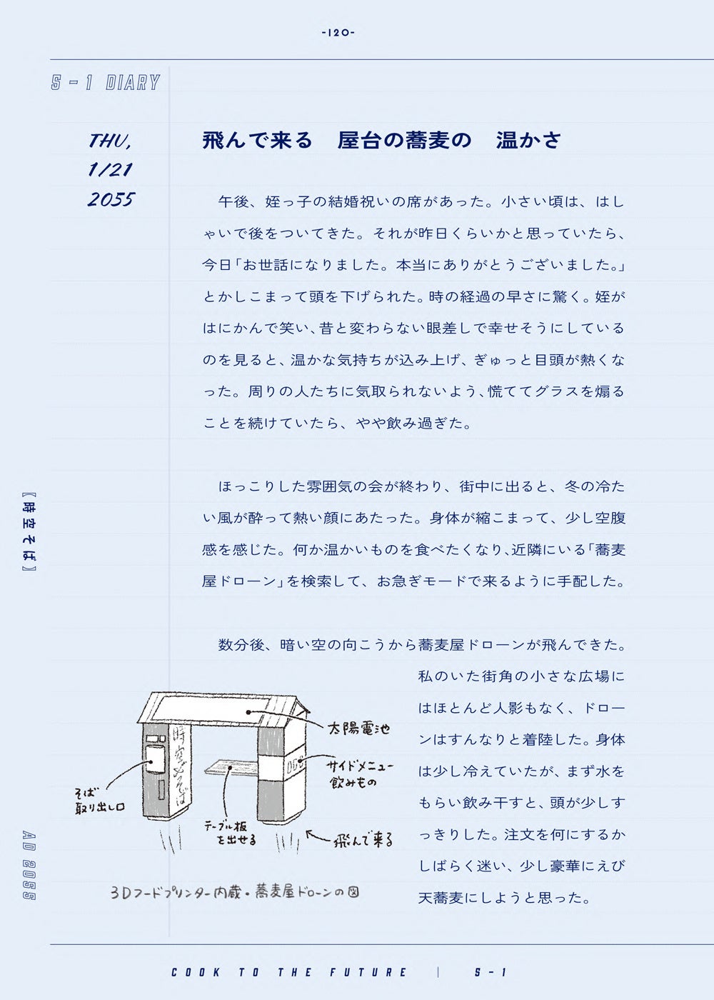 破壊的なイノベーションで進化する未来の食卓が、科学的な視点や未来の日記・イラストによってリアルに描かれる。