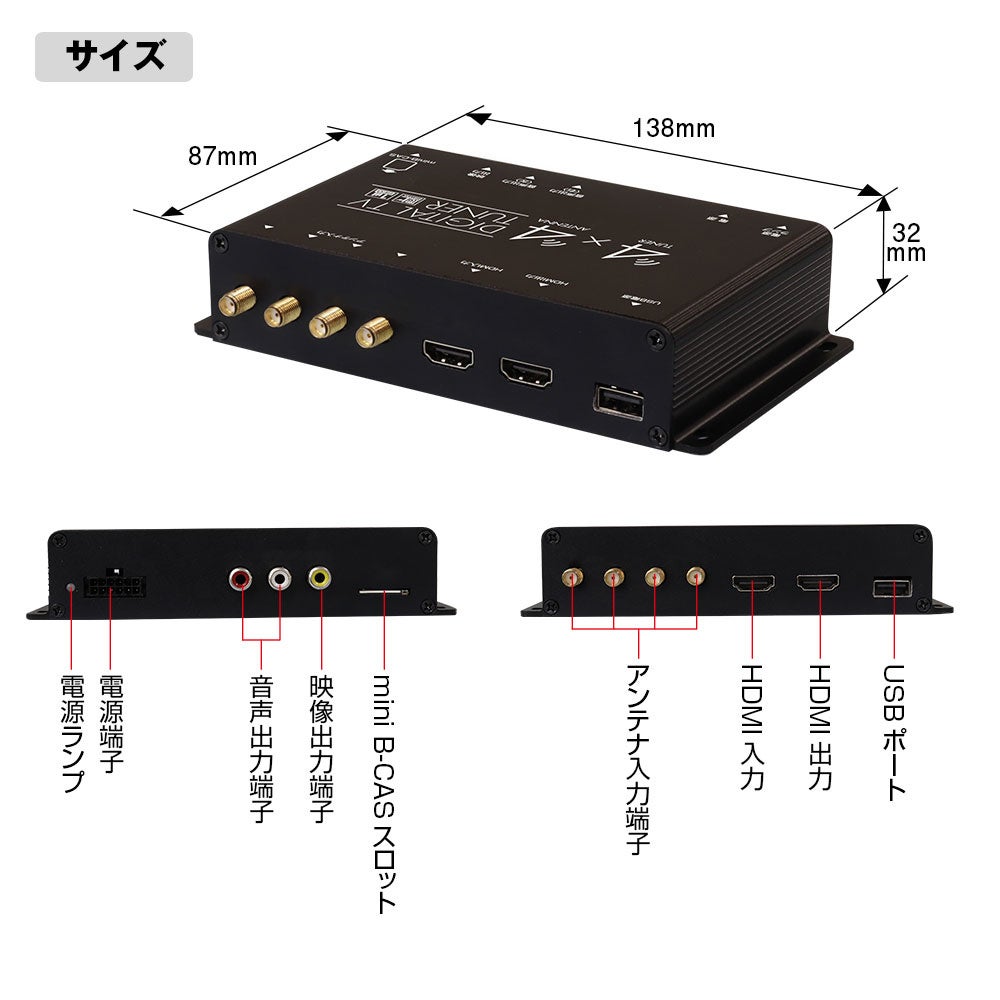 4アンテナ4チューナー方式で高画質なフルセグ放送を安定して受信可能な地デジチューナーです。HDMI入力端子搭載でFireTVstick/DVDプレーヤー/ゲーム機など様々な機器も楽しめます。
