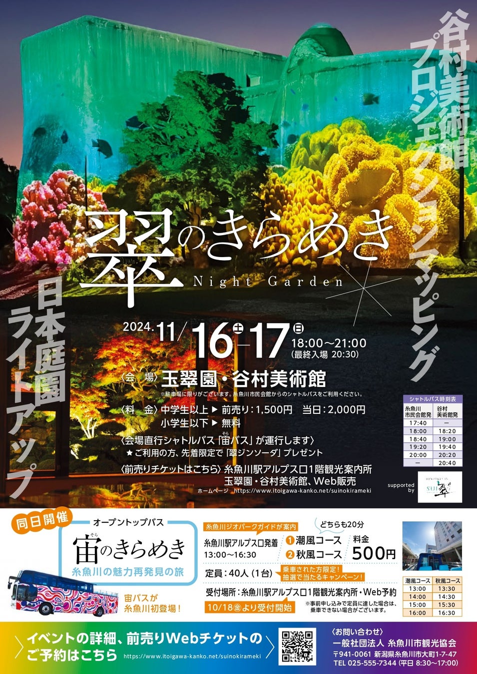 一般社団法人糸魚川市観光協会は、玉翠園・谷村美術館(新潟県糸魚川市)にて、庭園ライトアップ・プロジェクションマッピングを用いたイベント「翠のきらめき~Night Garden~」を開催します。非日常の光景が演出された景観を是非お楽しみ下さい。また、同期間の日中には糸魚川市内で初走行となるオープントップバス「宙(そら)バス」に乗車できる市内周遊ツアー「宙のきらめき」を開催します。日本海や紅葉の美しい風景を普段と違う角度からお楽しみいただけます。