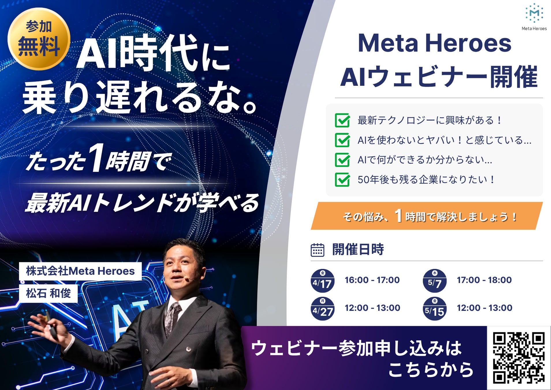 【無料オンライン開催】AIを活用する企業とそうでない企業の「格差」を乗り越える。Meta Heroesが「AIビジネス活用・実践セミナー」を4月・5月に開催決定!