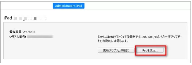 Step3:「概要」にある「iPadを復元」をクリックして初期化を始めましょう。