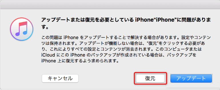 Step2:iTunesがインストールされたパソコンとiPadをケーブルで接続します。iTunes画面にメッセージが表示されるので「復元」をクリックします。