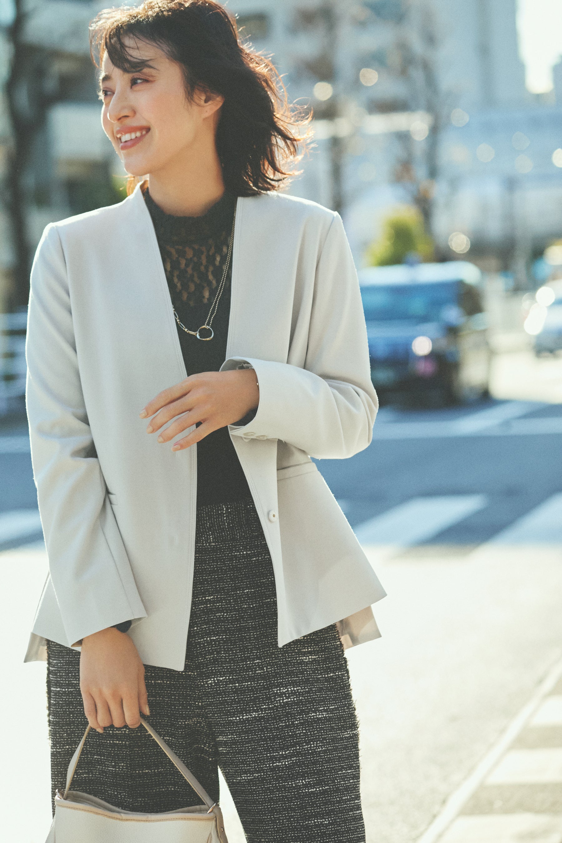 「ジャケットのきちんとした印象を頼りに、インナーのトップスにはレース、ボトムには軽やかなツイードを選んで抜け感あるお仕事スタイルに。ジャケットはベルトを外して前開きで着ると、フロントラインが高位置でXを描くシルエットで、スタイルがよく見えます。」(渡辺さん)
