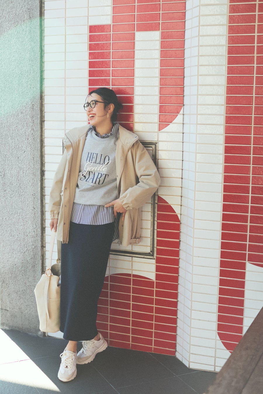 「ジャージー素材のスカートは、休日服にもすんなり馴染んでとにかく着回し力抜群。スエットやブルゾンと合わせれば、品の良い大人カジュアルスタイルが完成します。タイトシルエットながら深めのスリットで足捌きもよく、普段使いに色違いで欲しいくらい素材もデザインも優秀!」(渡辺さん)