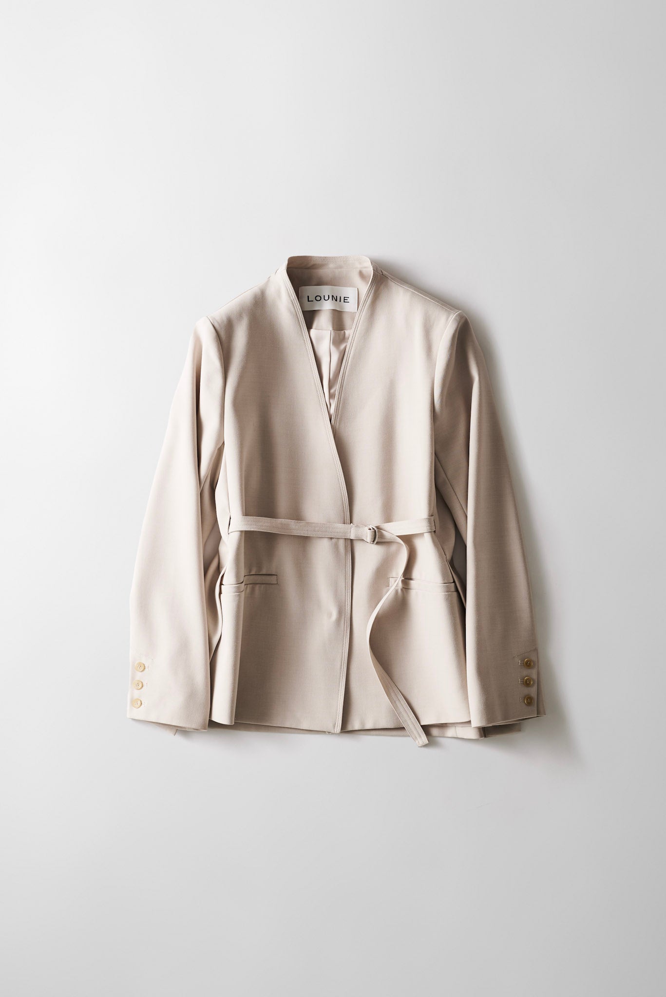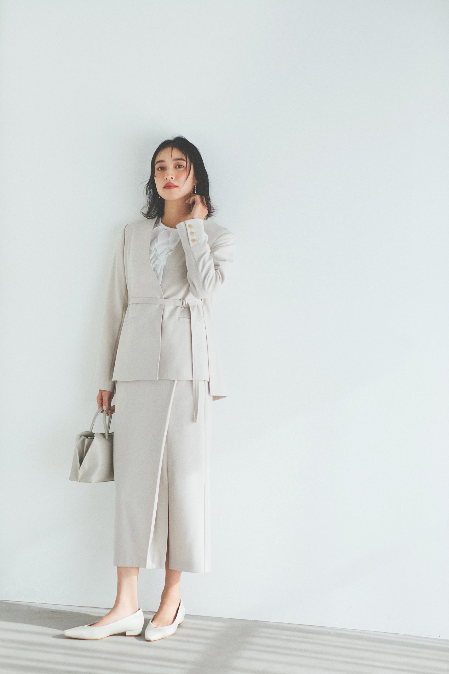 「セレモニーらしい特別感のあるジャケットスタイルをお探しの方におすすめ。ベルト使いやサイドに前後差で深く入ったベンツ、ラップ風のスカートなど所々に散りばめられたディテールに、袖を通した瞬間気分が上がる一着。