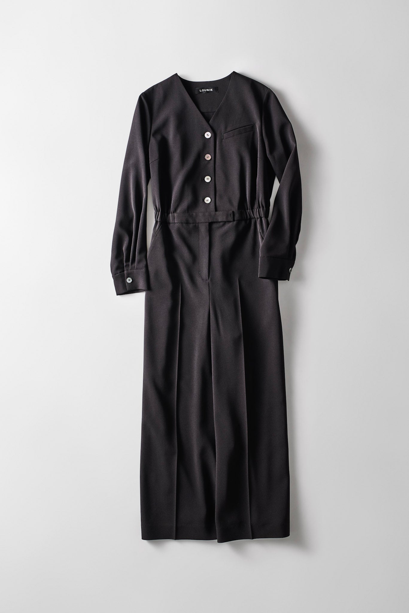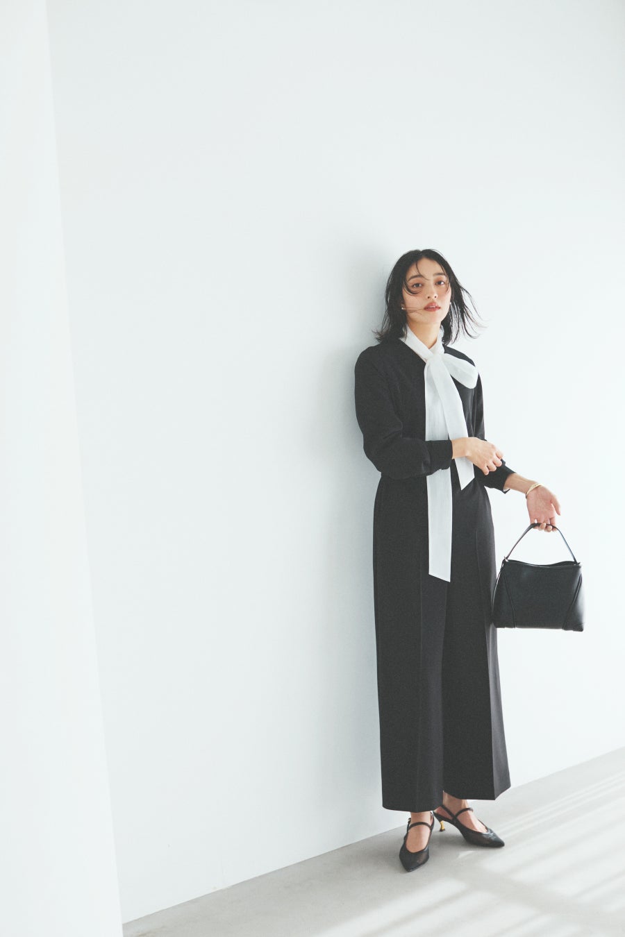 「すっきりとしたVネックデザイン、ウエスト部分にゴムを入れてスタイルアップ・・・“攻めと守り“がしっかり計算されたデザインが秀逸。ハンサムなオールインワンをセレモニー仕様にするなら、ボウタイブラウスを投入。大きめのリボンで華やかさをプラスして。」(渡辺さん)