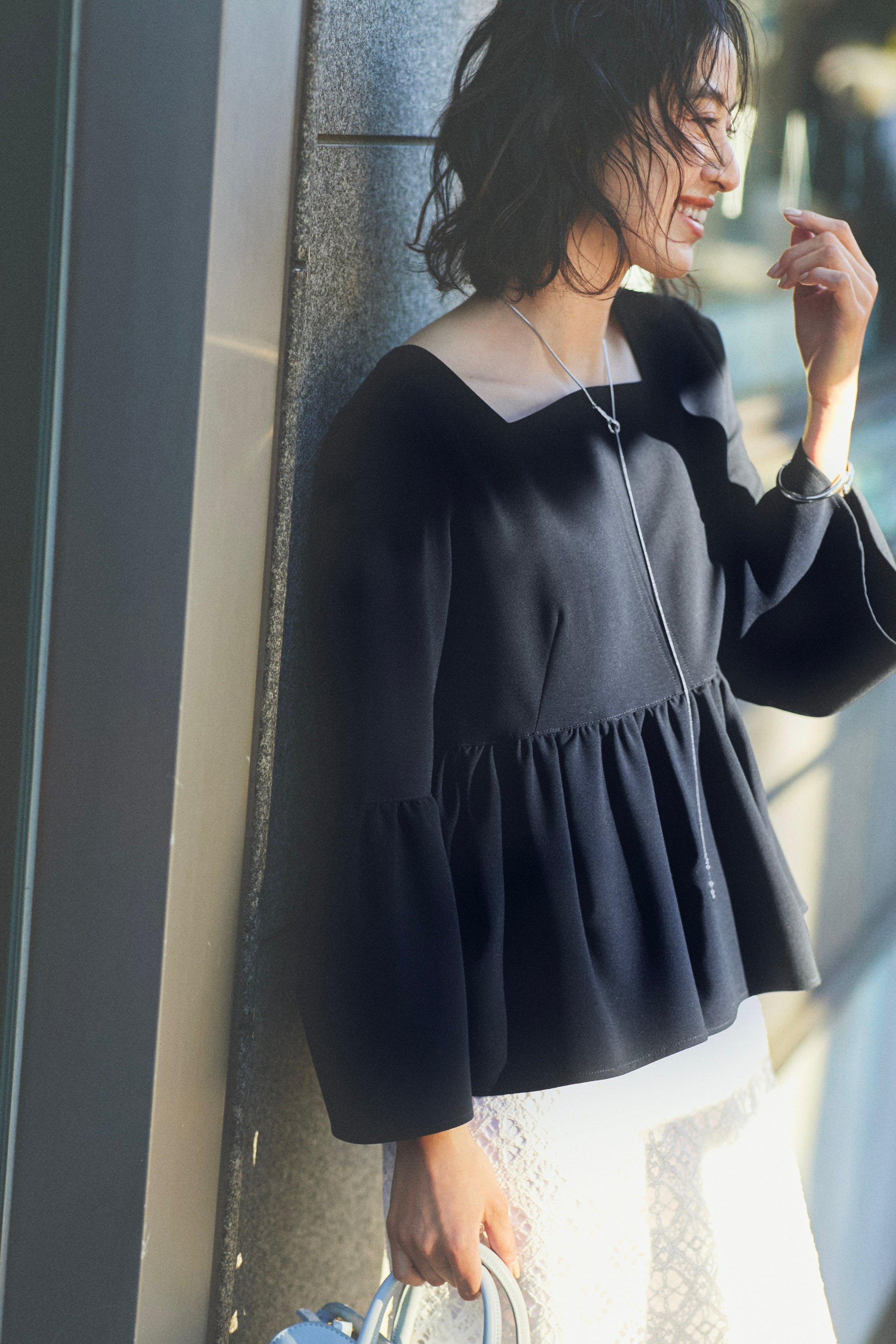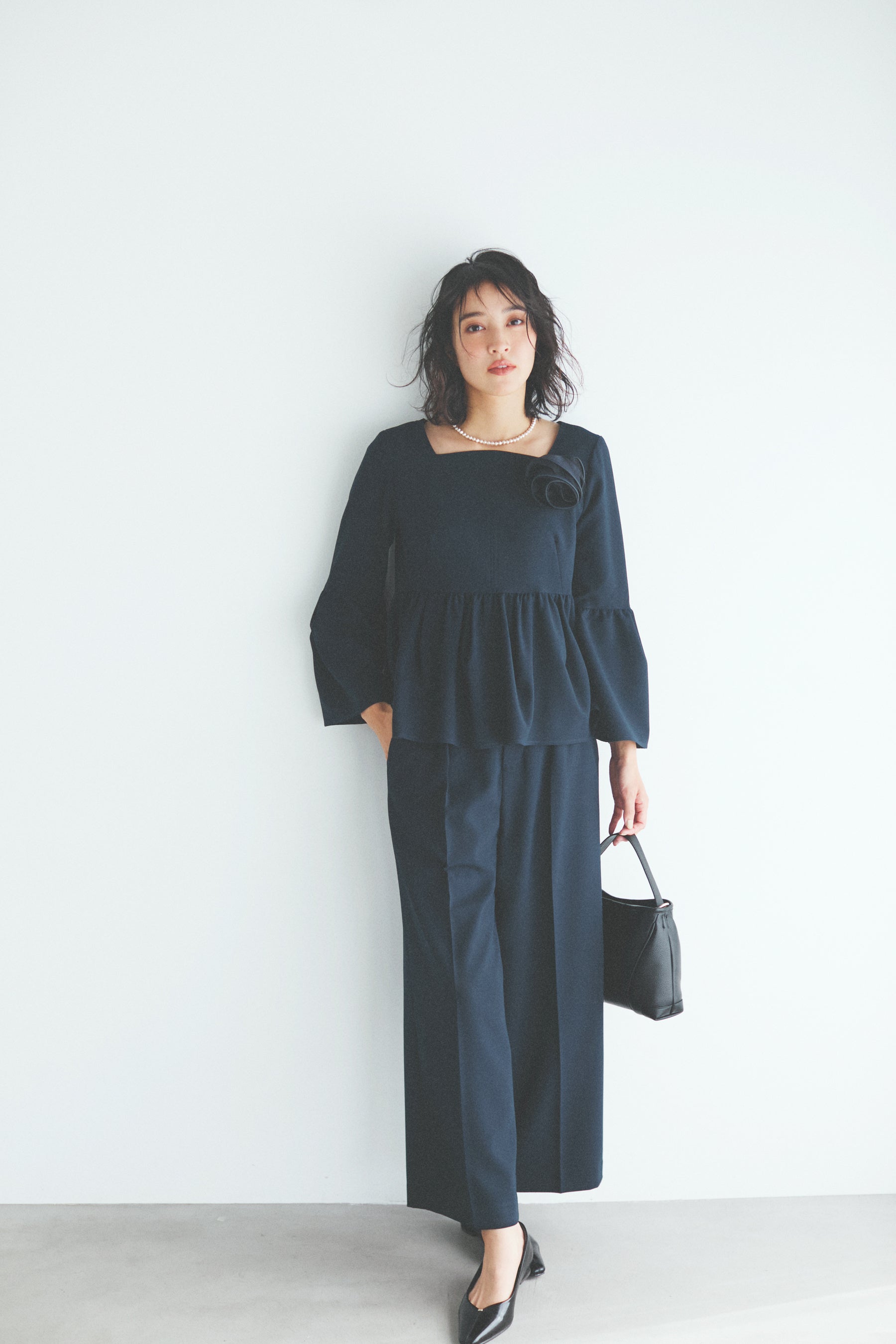 「定番になりつつあるプルオーバートップスのセットアップ。高めに入ったペプラムが体のラインを拾わず、ウエスト位置を高く見せ、スタイルアップを約束します。合わせのボトムはワイドパンツなのも今っぽく、安心してチョイスできますね。」(渡辺さん)