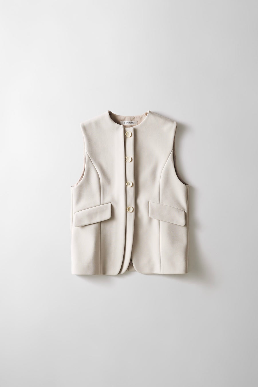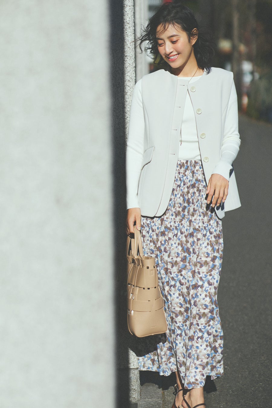 「ノーカラーの襟元や丸みを帯びた裾のカッティングが優しい印象のジレは、ふんわりしたスカートや柄物とも相性がよく、印象を変えた着こなしを楽しめます。」(渡辺さん)