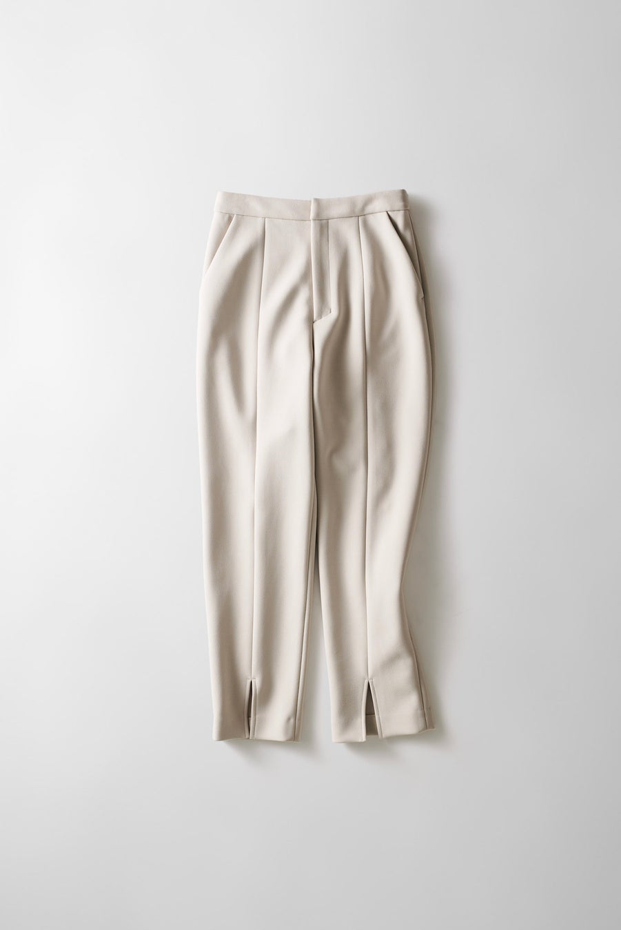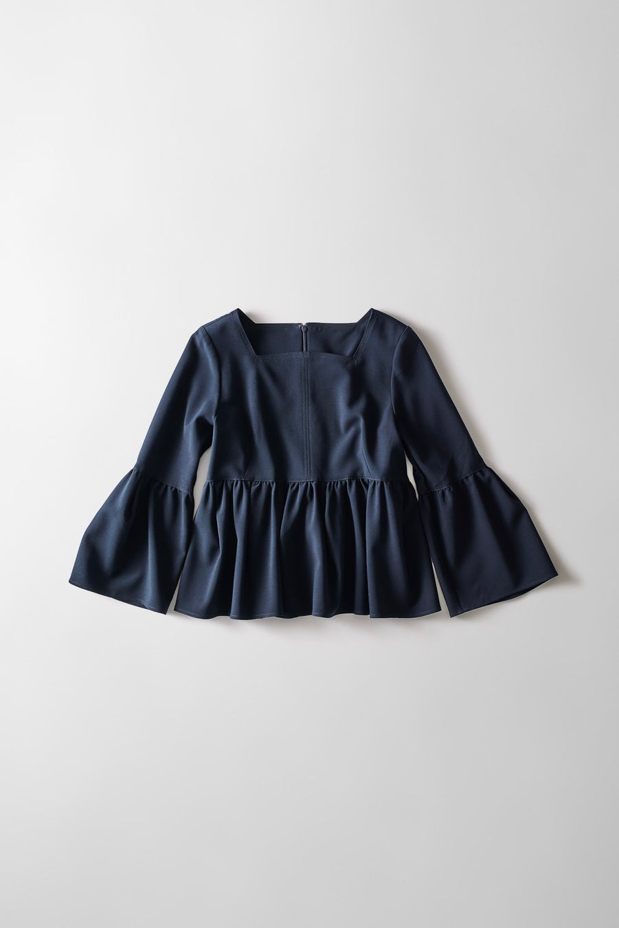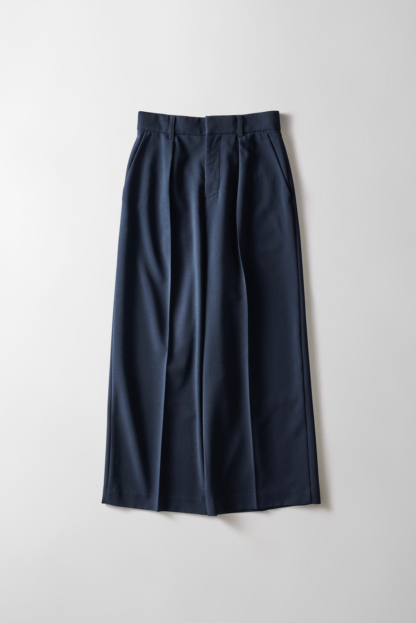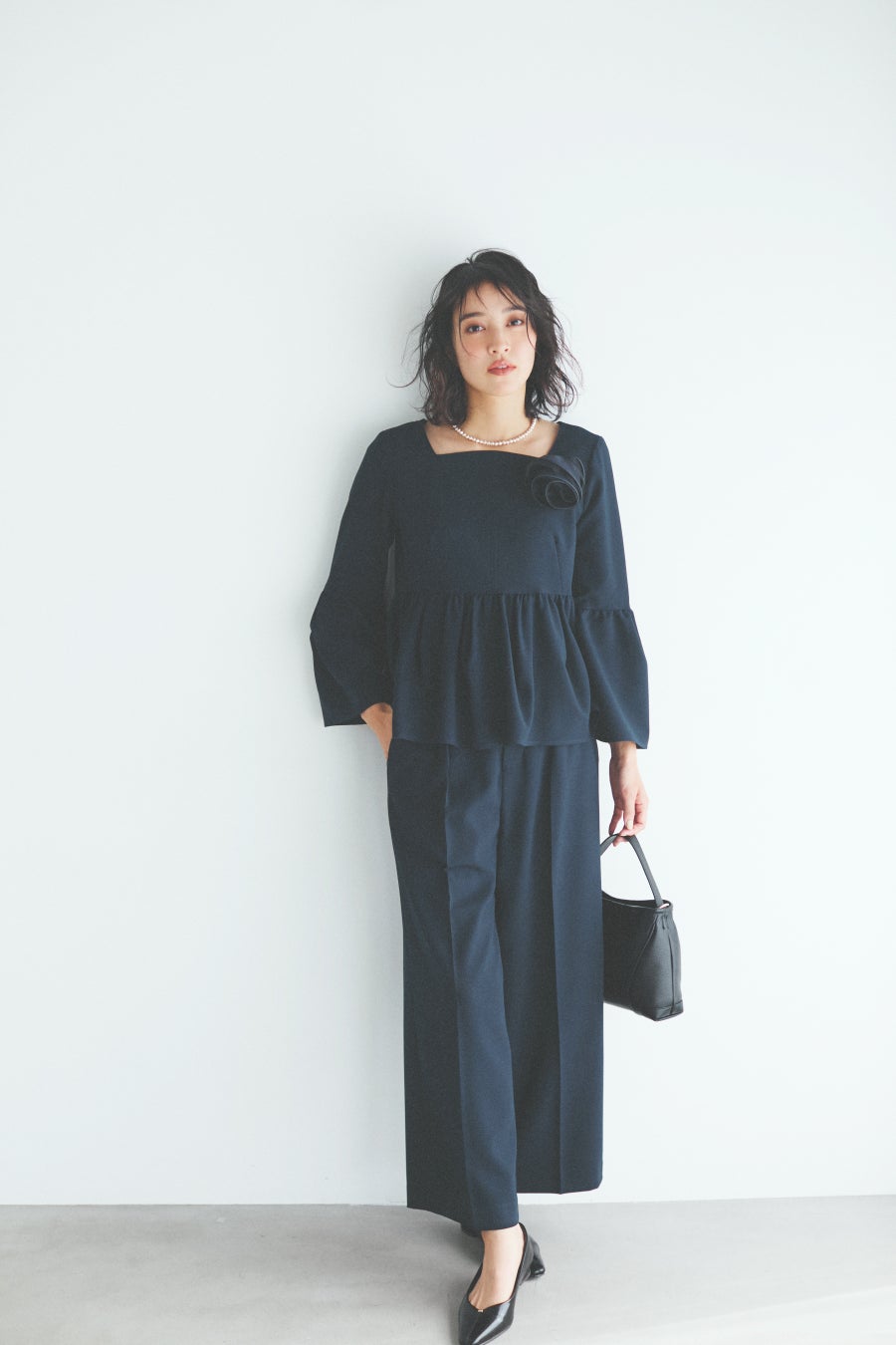 ブラウス、パンツ共に洗濯機洗いでき、ノーアイロンOKな素材。梳毛調のサラッとした肌触りで、シーズンレスで着用できます。ブラウスの襟元の印象的なスクエアカッティングが知的なアクセント。