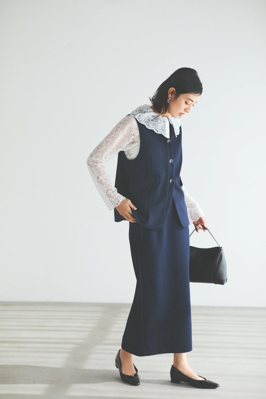 「ボトムを選ばずなんでも受け入れてくれる優秀トップスですが、今年らしいオフィススタイルにするならレーススカートがおすすめ。ブラウスのネイビーとレーススカートの白で抜け感と春の軽やかさを。」(渡辺さん)