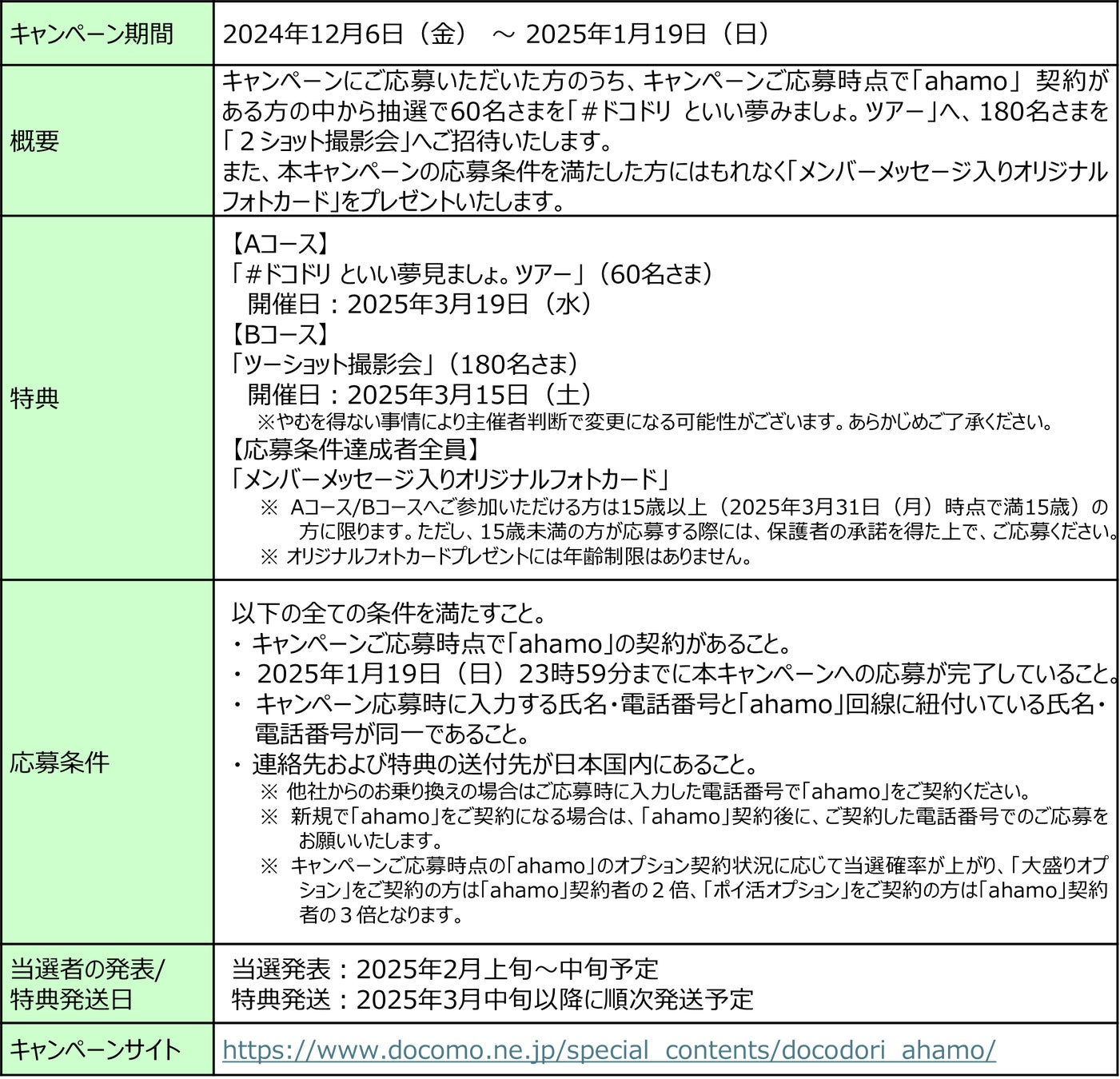 株式会社NTTドコモ(以下、ドコモ)は、「ahamo」契約者を対象に、#ドコドリ 選抜メンバー※(以下、メンバー)が自ら企画したファンミーティングに抽選で240名さまをご招待する「#ドコドリ ドリームファンミーティングキャンペーン」(以下、本キャンペーン)を2024年12月6日(金)から 2025年1月19日(日)までの期間で開催いたします。