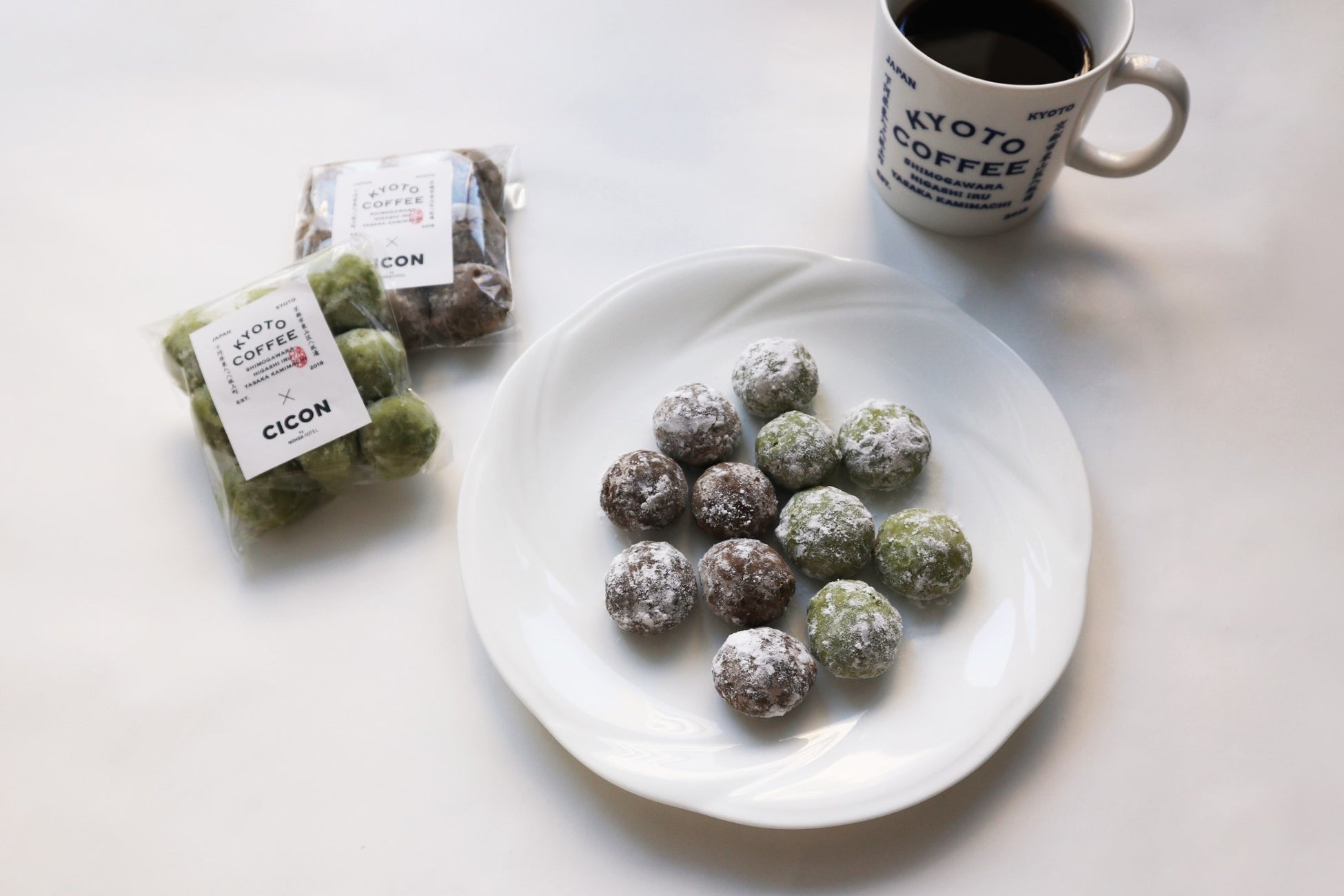 かねてよりお客様からKYOTO COFFEEに合うフードメニューの要望をいただき、この度、京都市内のベーカリーカフェ「CICON BAKERY by NOHGA HOTEL(シコンベーカリー バイノーガホテル)」とコラボ―レーションし、『KYOTO COFFEEスノーボール』が完成しました。KYOTO COFFEEの味わいにマッチする柔らかな甘みと、口の中でほろほろと崩れる食感は、機械を使わない丁寧な手仕事により実現しています。フレーバーは京都で150年以上続く老舗茶舗の茶を練り込んだ「抹茶」と「ほうじ茶」の2種類をご用意しました。ご自宅で楽しめる『KYOTO COFFEEブレンド』や『KYOTO COFFEEブレンドドリップバッグ』とのフードペアリングを楽しんだり、家族や友人へのおみやげにしやすいアイテムです。