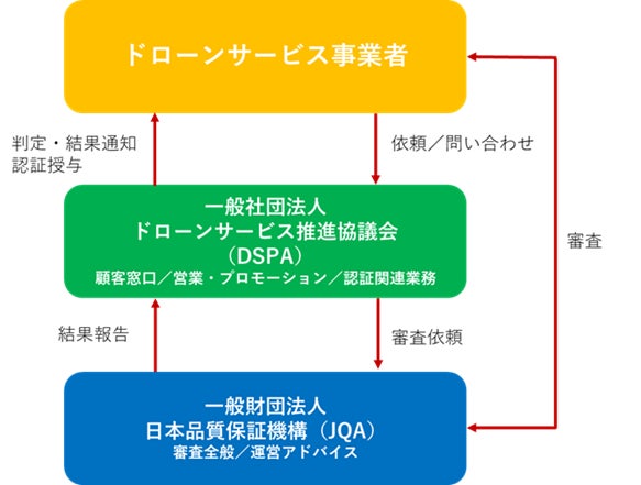 【役割】認証:一般社団法人ドローンサービス推進協議会(DSPA)/審査:一般財団法人日本品質保証機構(JQA)