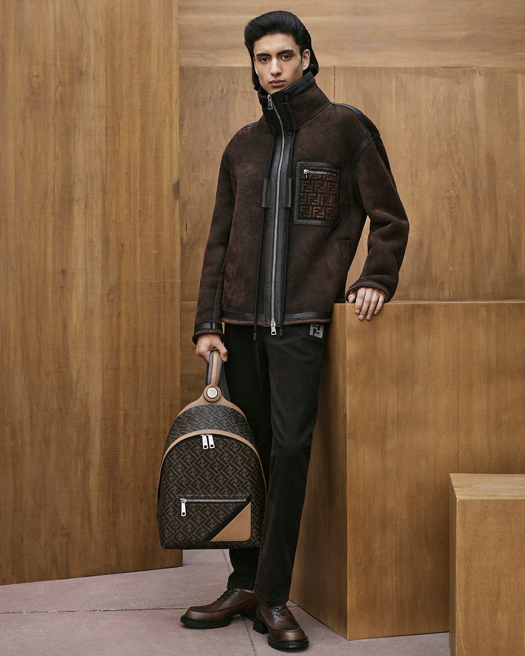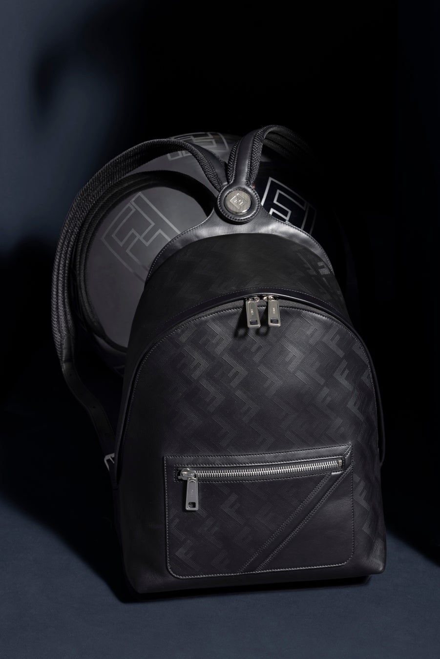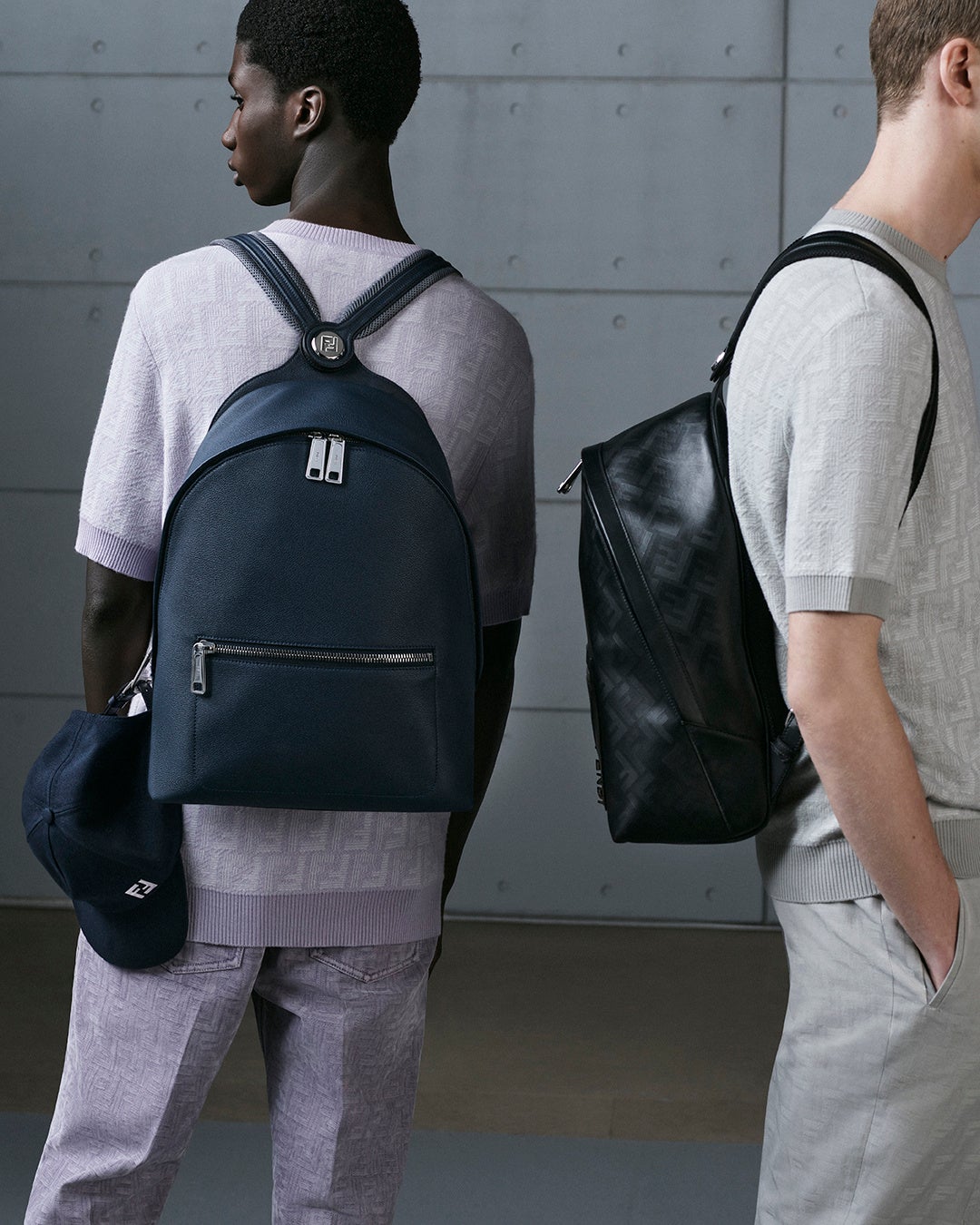 異なるレザーの仕上げとパレットの組み合わせがフェンディの卓越した職人技を表しています。ダークブルーの色合いがタイムレスな魅力を放ち、フェンディのシグネチャーである「クオイオ ローマ(Cuoio Roma)」レザーの繊細な質感を際立たせます。フェンディメンズのシグネチャーである「フェンディ ダイアゴナル(FENDI Diagonal)」の世界が、ポケットにあしらわれたスランティングレザーカットを通じて表現され、控えめで立体的な「FF」ロゴが特徴的な「フェンディ シャドウ(FENDI Shadow)」モチーフのレザーのワークマンシップは、不変のブラックカラーによってその質感がさらに高められています。