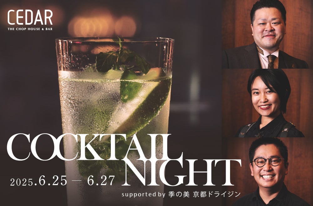 3名の季の美 バーテンダーアンバサダーが1日1名ずつ「CEDAR THE CHOP HOUSE & BAR」の店舗に立ち、「季の美」を使ったスペシャルカクテルを提供する「COCKTAIL NIGHT supported by 季の美 京都ドライジン」を2025年6月25日(水)、26日(木)、27日(金)の3夜連続で開催します。イベントでは、和のボタニカルが香る「季の美」を使った、各バーテンダーオリジナルのカクテルをお愉しみいただけます。