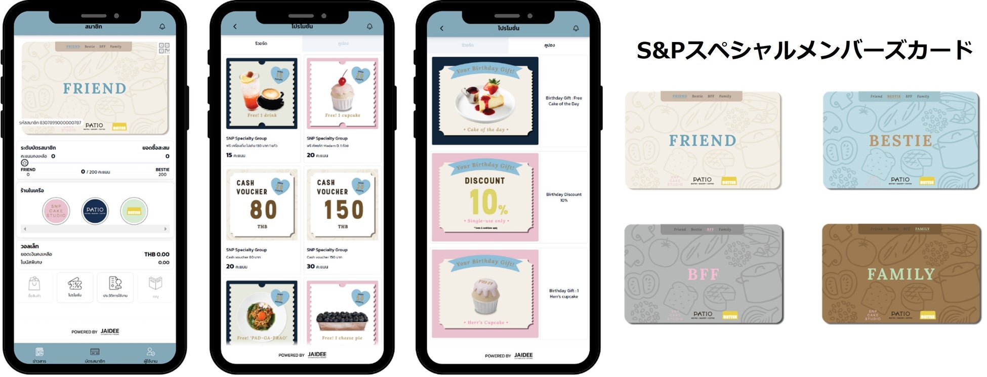 バリューデザインのモバイル CRM サービスとポイントシステムを導入したS&P Syndicate Public Co.,Ltd.は、タイ国内外に517店舗以上のフード、ベーカリー、飲料サービスを提供している企業です。今回の連携では、オーダーメイドケーキショップ「SNP CAKE STUDIO」(1店舗)とレストラン「PATIO」(1店舗)の計2店舗が対象となっており、2024年11月から、リピーターの獲得促進を目的にサービス提供を開始しています。会員は50バーツの利用ごとに1ポイントを獲得でき、貯まったポイントはキャッシュバウチャーと交換可能です。