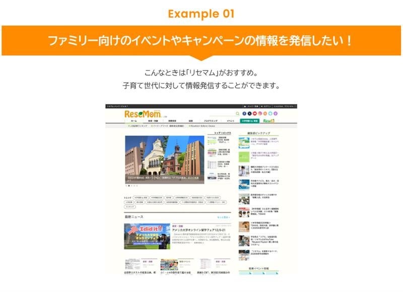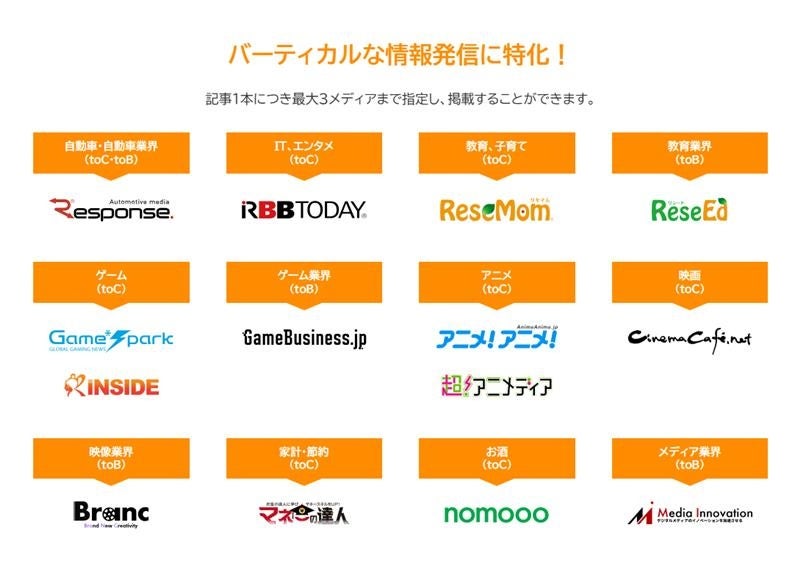 イードが運営するバーティカルメディアの中から最適なメディアを最大3つまで指定し、1本の記事を同時掲載できます。たとえば、ファミリー層向けなら「リセマム」、アニメや映画の情報発信なら「アニメ!アニメ!」・「超!アニメディア」・「シネマカフェ」など、多彩なカテゴリーに対応します。各ジャンルに強いコアユーザーにリーチできるため、訴求力が高まります。また、記事内にリンクの設置も可能です。