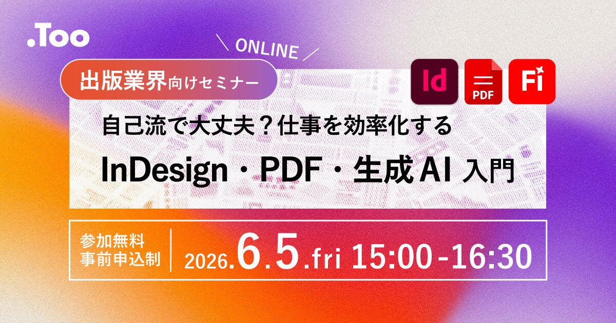 クリエイティブ市場の総合商社・株式会社Too(本社/東京都港区虎ノ門3-4-7、社長/石井剛太、以下Too)は、出版業界向けセミナー「自己流で大丈夫?仕事を効率化するInDesign・PDF・生成AI入門 」を2026年6月5日(金)にオンラインで開催します。