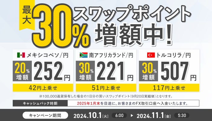 SBI FXトレード株式会社(本社:東京都港区、代表取締役社長:藤田 行生)は、10月1日よりメキシコペソ/円、南アフリカランド/円、トルコリラ/円のスワップポイントを増額するキャンペーンを実施しております。増額率はメキシコペソ/円で+20%、南アフリカランド/円、トルコリラ/円で+30%となります。