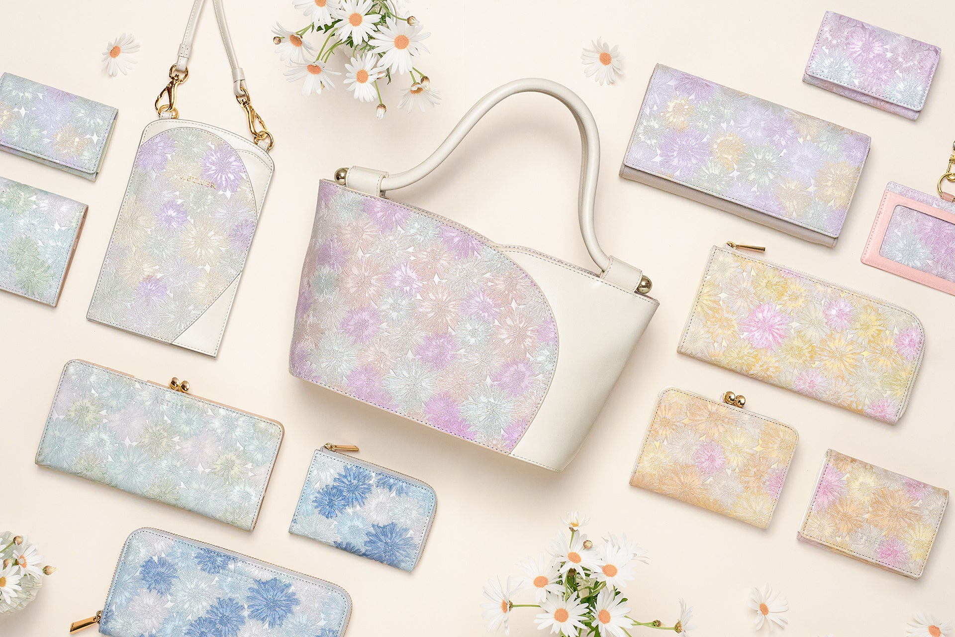 桜やバラ、マーガレットほか、約17種もの花々をモチーフとして、持つ人を華やかに引き立てる美しい財布、バッグ、キーケースなどをラインナップ。