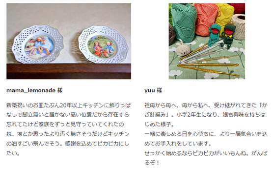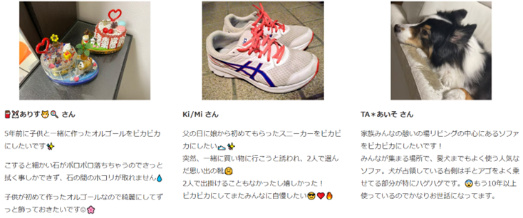 「何かをピカピカにしたい」という想いの背景には、それを大切にする持ち主の想いや、一緒に使っていた家族との思い出、贈ってくれた友人との絆など、人生で出会う様々な人たちと織りなすストーリーがあります。その「何か」にまつわるエピソードが情景としてはっきりと浮かび、ピカピカにしたい気持ちを特にあと押ししたくなってしまう作品を、大賞として選ばせていただきました。