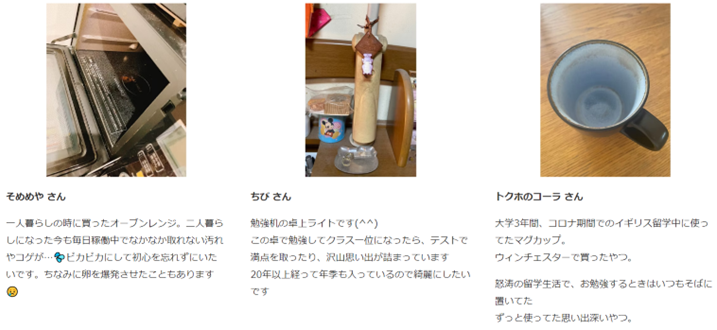 輝く青春時代に、部活や勉強を一生懸命頑張って苦楽を共にした相棒のような存在のものたち、初めての一人暮らしで不安な気持ちでいっぱいだったあの頃を思い出して、「今日もがんばろう」、そんな前向きな思いを感じさせる作品を選ばせていただきました。