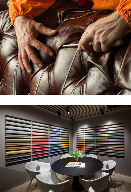 独特な柔らかさを持つ最高級の革「ペレ・フラウ」は、厳選された上質な仔牛の皮を丁寧に加工し、厳格な品質管理を経て生まれます。やわらかく肌に馴染むこの革は、曲線を表現するのに最適。この革があってこそ、ポルトローナ・フラウ社の“家具芸術”なのです。