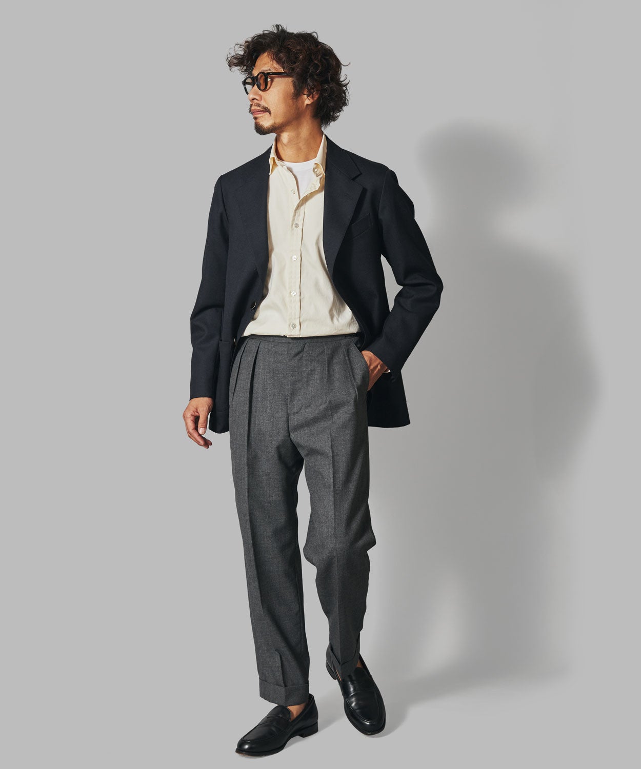 「今回はブリティッシュメイドのお客様にとって馴染み深い、オックスフォード系の素材を提案したいという思いがありました。 ただ、どこにでも売っているような定番色だとやはり退屈。 そこで、うっすらとトーンのあるエクリュ色を選びました。 こういったニュートラルカラーのシャツは最近スタイリングでもよく活用しているのですが、色が濃すぎると少々合わせが難しい。 なので、白シャツと同じ感覚で合わせられるエクリュカラーはとても使いやすいと思います」 (四方さん)