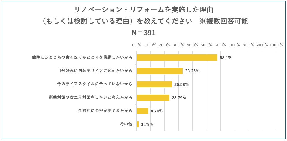 「リノベーション・リフォームを実施した理由(または検討している理由)を教えてください」と尋ねたところ、「故障した部分や古くなった部分を修繕したいと考えたから」という回答が最も多く、全体の6割弱を占めました。次いで、「自分好みの内装デザインに変えたいから」や「現在のライフスタイルに合っていないから」といった理由が多く挙げられました。このことから、ライフスタイルや趣味嗜好に合わせた空間にしたいという需要も一定数あることが分かりました(図1)。