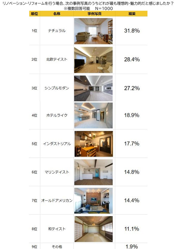 さまざまな内装デザインの事例写真とデザイン名称を掲載した9つの選択肢を用意し、「リノベーションやリフォームを行う場合、次の事例写真のうちどれが最も理想的・魅力的だと感じますか?」と質問しました。その結果、最も人気があったのは「ナチュラル」の事例でした(図4)。次に人気だったのは「北欧テイスト」(28.4%)や「シンプルモダン」(27.2%)で、このことから、自然素材を用いたシンプルなデザインの内装が好まれる傾向があることが分かりました。