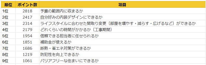 リノベーション・リフォームを経験済み、または検討中の方に対し、「リノベーションやリフォームをする際に大事にしたいこと(または検討する際に大事にしたいこと)の優先順位を第1位から第9位まで教えてください」と尋ねました。その結果、第1位として最も多く選ばれたのは「予算の範囲内に収まるか」(2818ポイント)、第2位は「自分好みの内装デザインにできるか」(2417ポイント)でした(図2)。このことから、予算内でどれだけ自分の理想とする住まいを実現できるかを重視する傾向があることが分かりました。