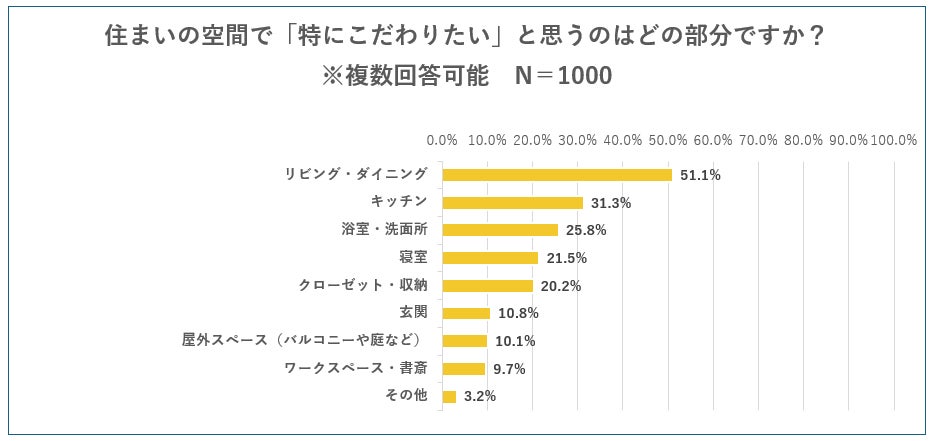 住まいの中で特にこだわりたい空間について尋ねたところ、半数以上の方が「リビング・ダイニング」と回答しました(図3)。また、「キッチン」や「浴室・洗面所」もこだわりたい空間として多く挙げられました。このことから、利用頻度が高い場所や長時間過ごす空間ほど、こだわる傾向が強いことが分かりました。