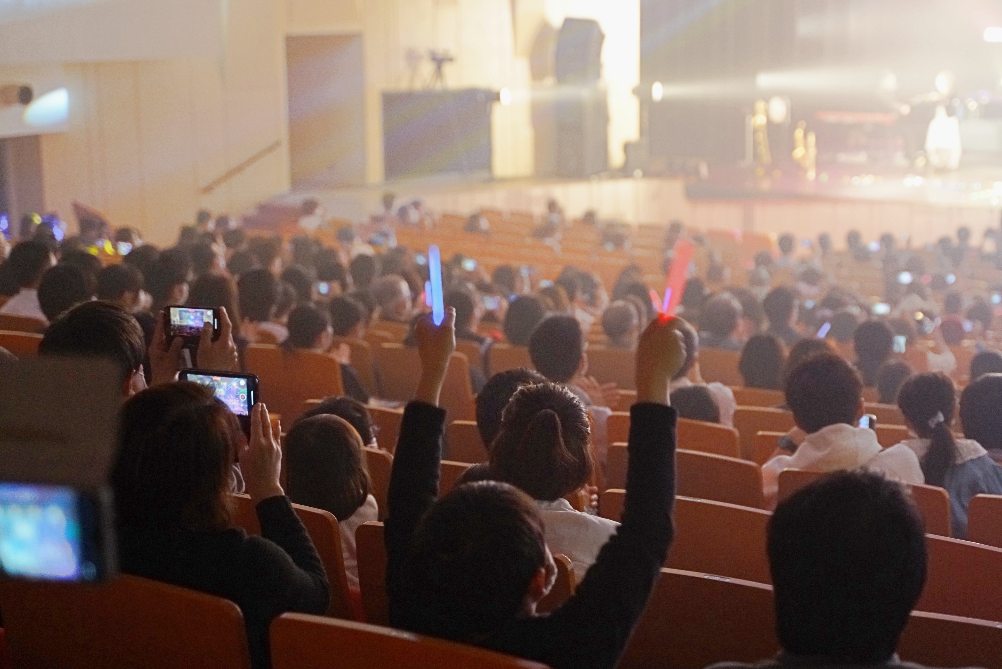 ペンライトなどの演出アイテムを身に付けて、観るだけではなくみんなで一体となって楽しむことができます。