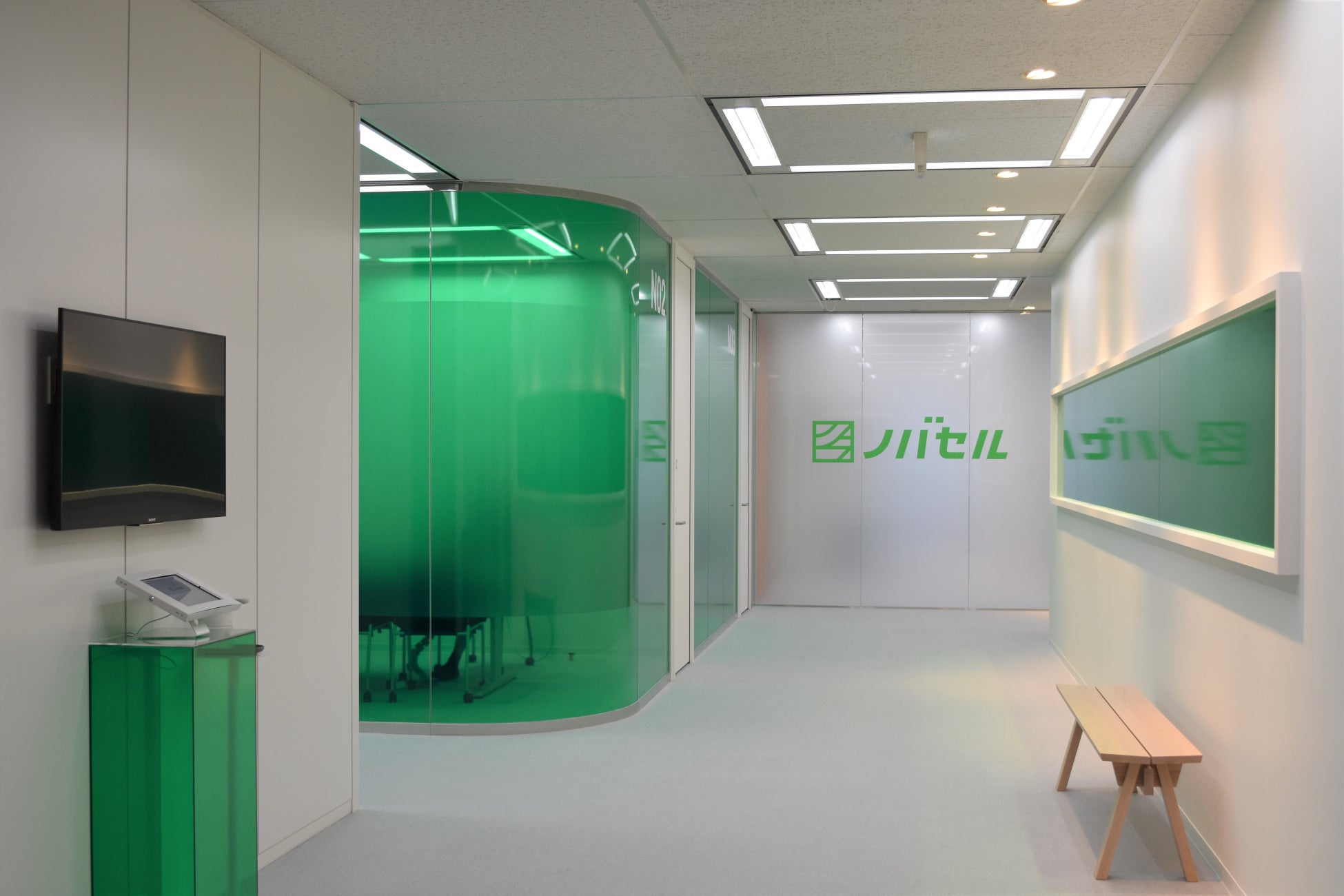 移転先には、ラクスルの目黒オフィスが入居するビルの上階を選び、フロア一帯にはノバセルのイメージカラーであるグリーンの壁や装飾を施しております。